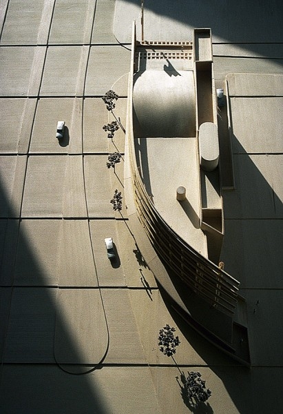The east facing louvered façade for sun control follows the contour of the elongated corner site.