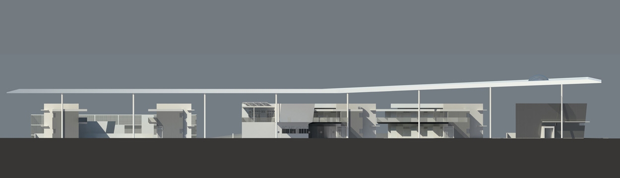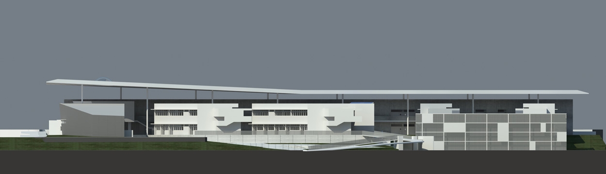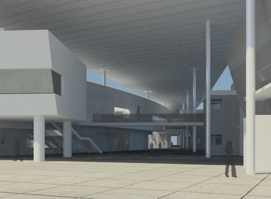 The basic conceptual and organizational idea of the design of this competition entry for the replacement for an existing high school was meant to be an expression of what was previously mentioned, by the generating of a central shaded pedestrian axis running from the south facing main entrance to the high school complex through to the northern secondary entrance. A secondary axis is generated running east west which connects the existing pedestrian overpass to the reconfigured athletic fields. The cross road of these axis, is defined by stairs, bridges and elevators which provide direct access to common facilities such as an outdoor amphitheater, cafeteria, teachers lounge and student gathering spaces.