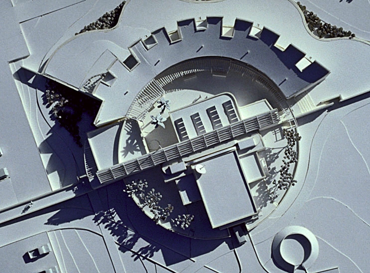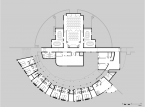 A precedent for this hybrid financial services building could be a monastery. It combines dormitory and dining facilities that partially encircle and enclose a shaded courtyard with adjoining educational and meeting spaces and a centrally located library. The plan, elevated on a cylindrical podium, is an asymmetrical assemblage of circle and rectangles organized along an extruded in section, east west axis which relates to early 20th century abstract works of art.