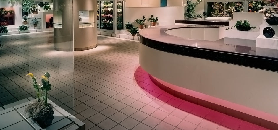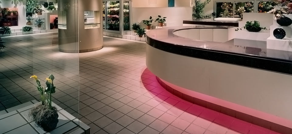 Its interior architecture allowed the display of flowers within and upon articulated stepped surfaces and recesses, while integrating the refrigeration units into the overall design.