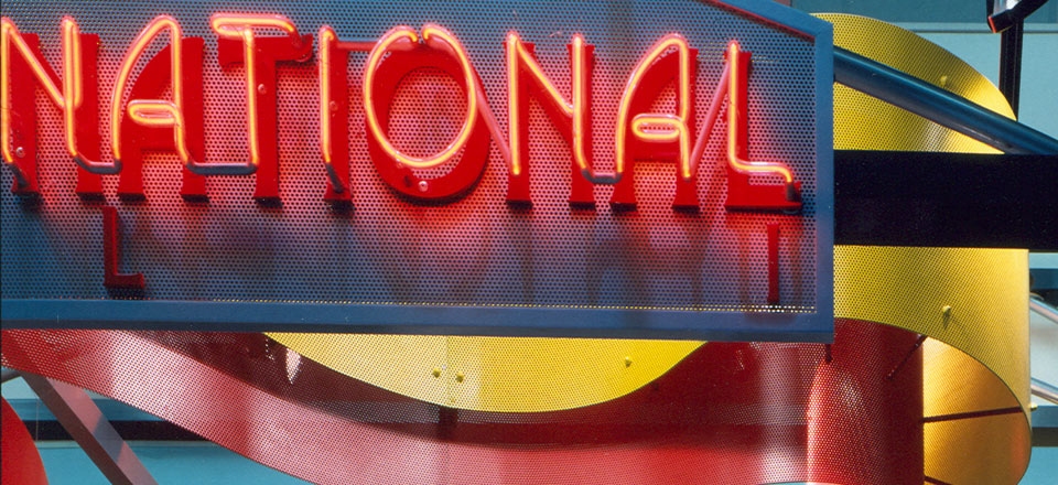 The signature red and yellow perforated steel ribbon generates a strong graphic presence in its site. It also provides visual interest when viewed from the mezzanine above, an elevation often ignored in retail environments.