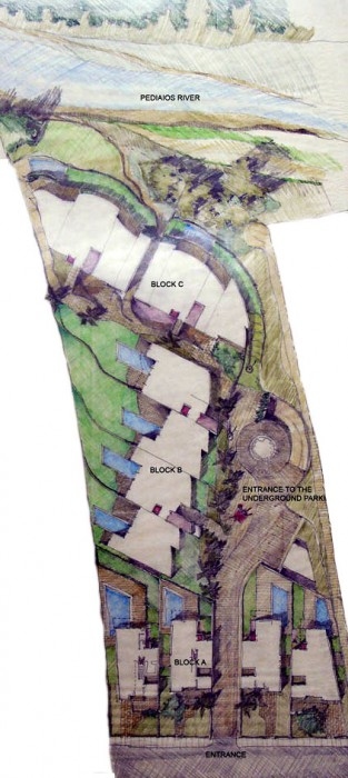 The siting of the three residential groups part of the master plan respond to the contrasting site conditions posed by the Pedieos riverbed, the modernist residential architecture of Gladstonos Street, and the challenges of the adjoining properties. The total site consists of 7600 square meters which accommodate 34 residential units all served by below grade parking.