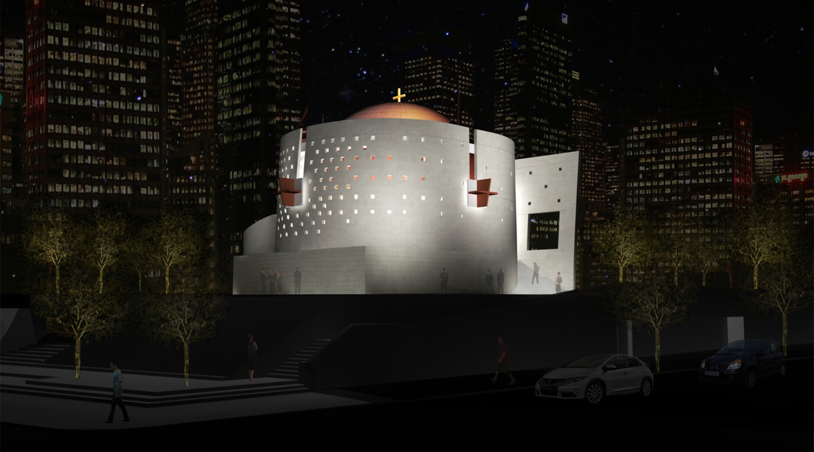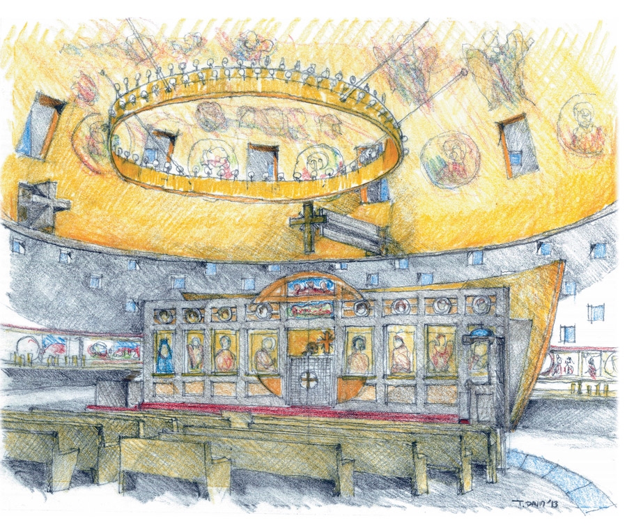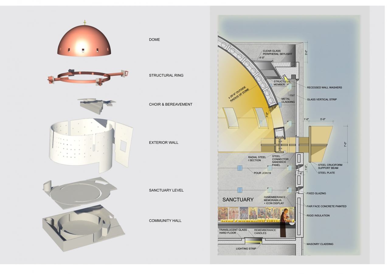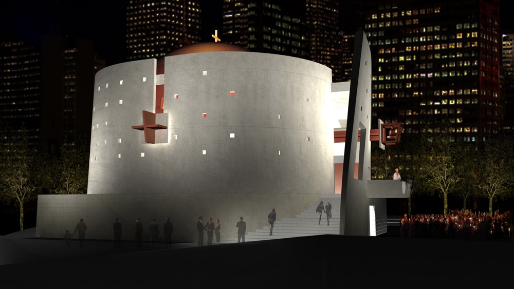 The idea for this design proposal for the rebuilding of the Saint Nicholas Greek Orthodox Church at the World Trade Center site, was generated by an abstraction of symbols specific to the Orthodox Christian liturgy and tradition, combined with the geometrical space of a sphere which often symbolizes universality, as well as a response to the desire of the congregation for an ecumenical space.